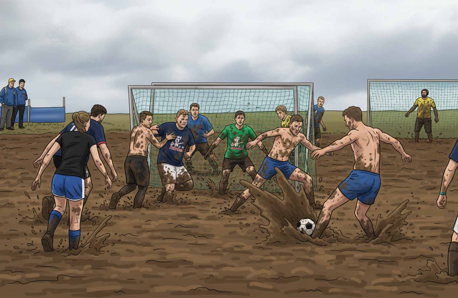 Yes, it exists—and it’s every bit as messy as it sounds. Played in thick mud, running becomes a heroic act and scoring a goal is nothing short of a miracle. Mud up to the knees, players that look like survivors of a paintball war, and the referee? Poor soul.