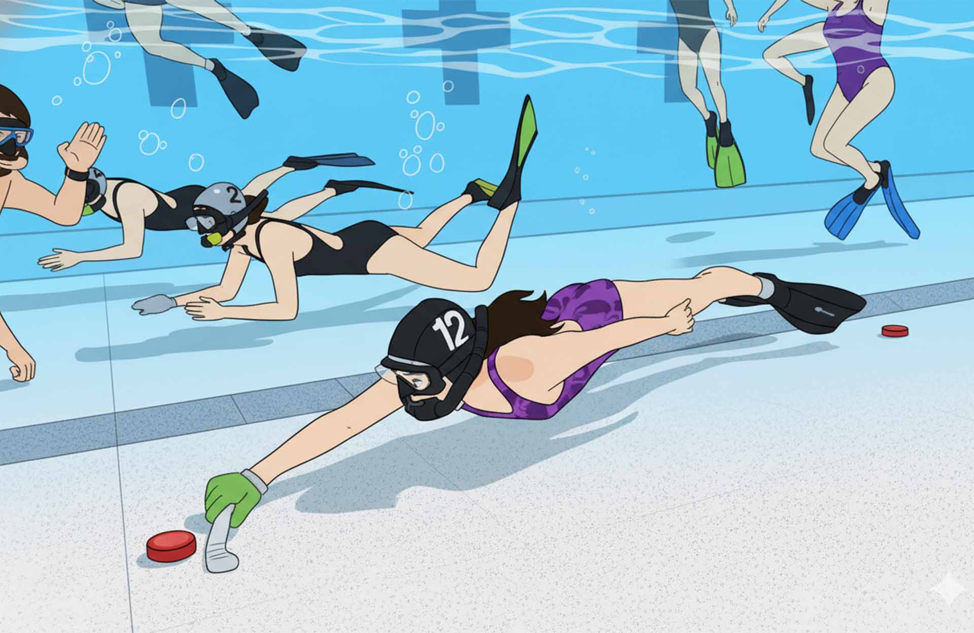 Players dive to the bottom of a pool, pushing a puck with a tiny stick while holding their breath and avoiding collisions. It’s like watching hockey in slow motion—bubbles, chaos, and athletes surfacing for air like synchronized swimmers gone rogue.